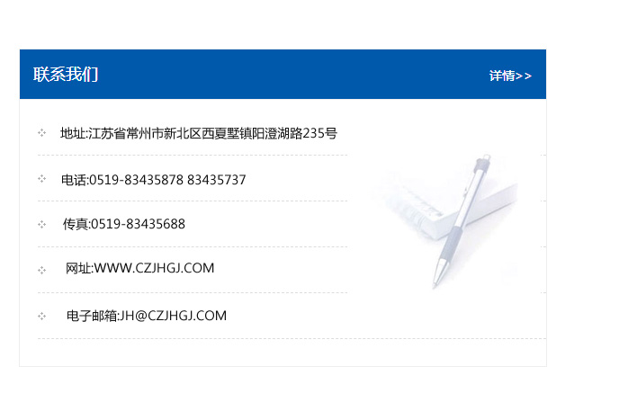 地址:常州市新北區友邦商務大廈1幢16、17層  電話:0519-85101652  傳真:0519-85112595  郵編:213022  網址:www_cz-jiayue_cn.zchuangkj.com  郵箱:xiajifengaa@163.com